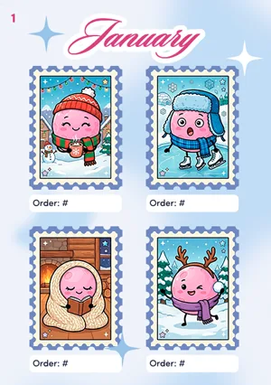 Download the Passport and keep it somewhere safe. Each month has its own page with 4 stamp slots. When you place an order, we’ll include one stamp with your package (random design). When it arrives, just stick it in that month’s page. You don’t need to collect all 4 designs, 1 stamp per month is enough.
