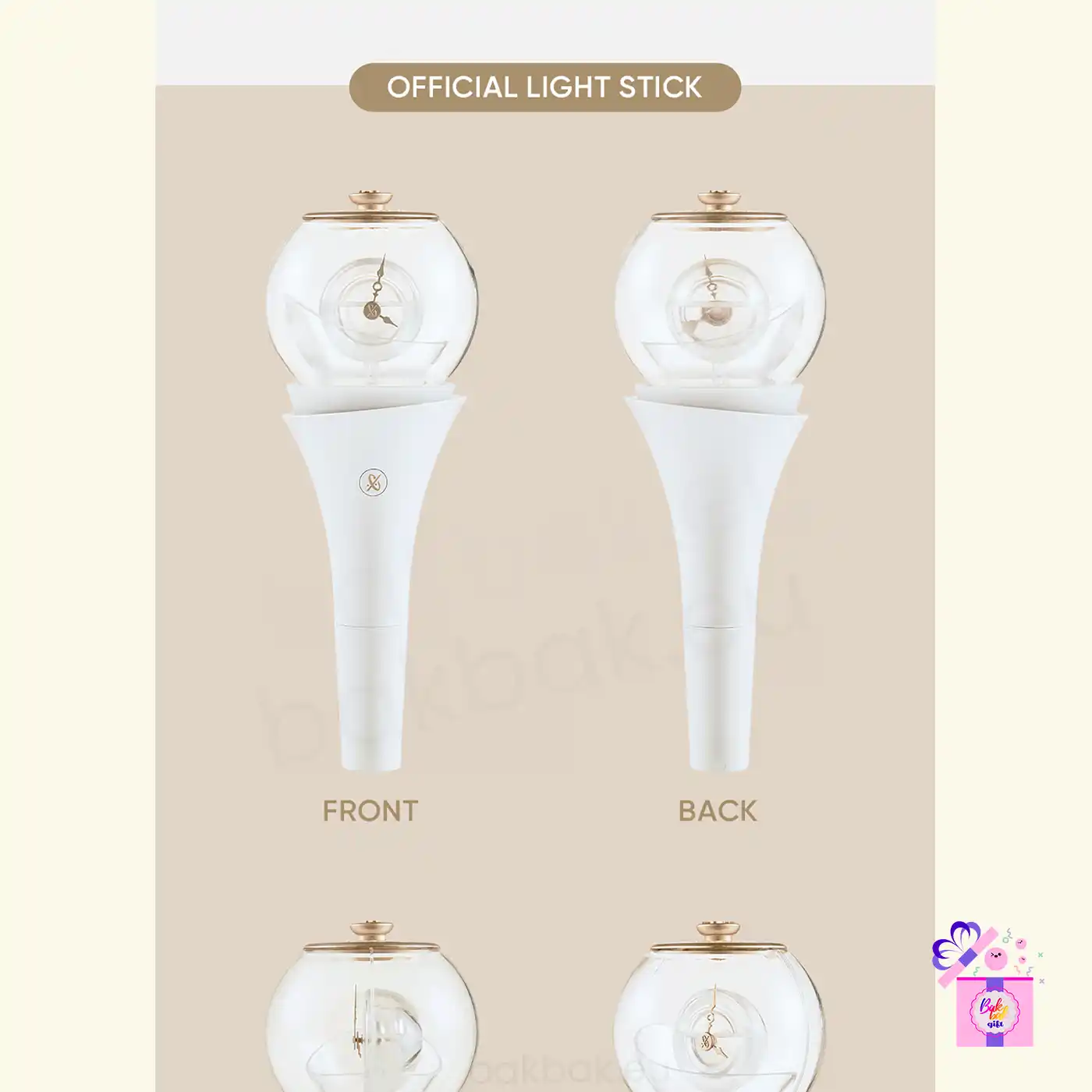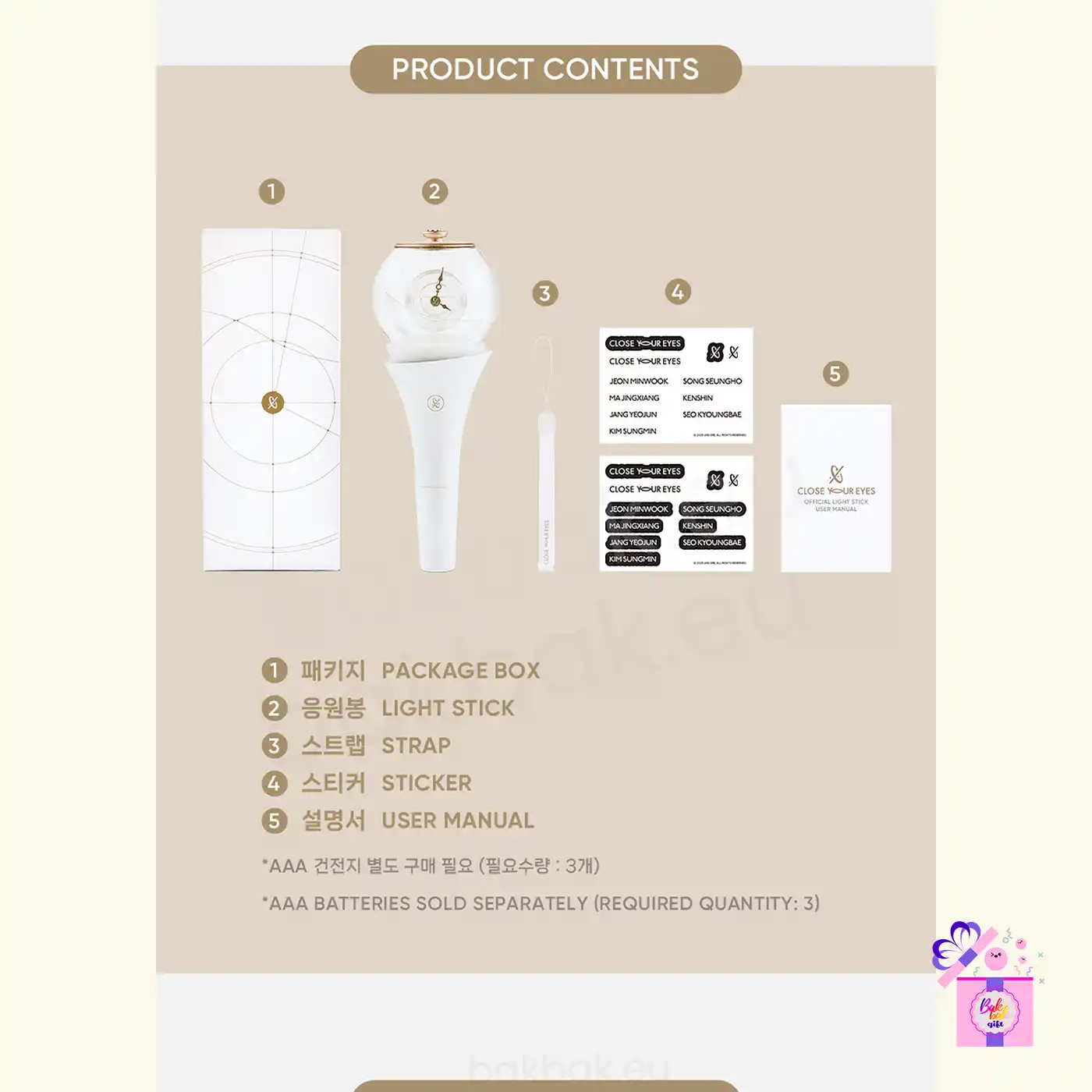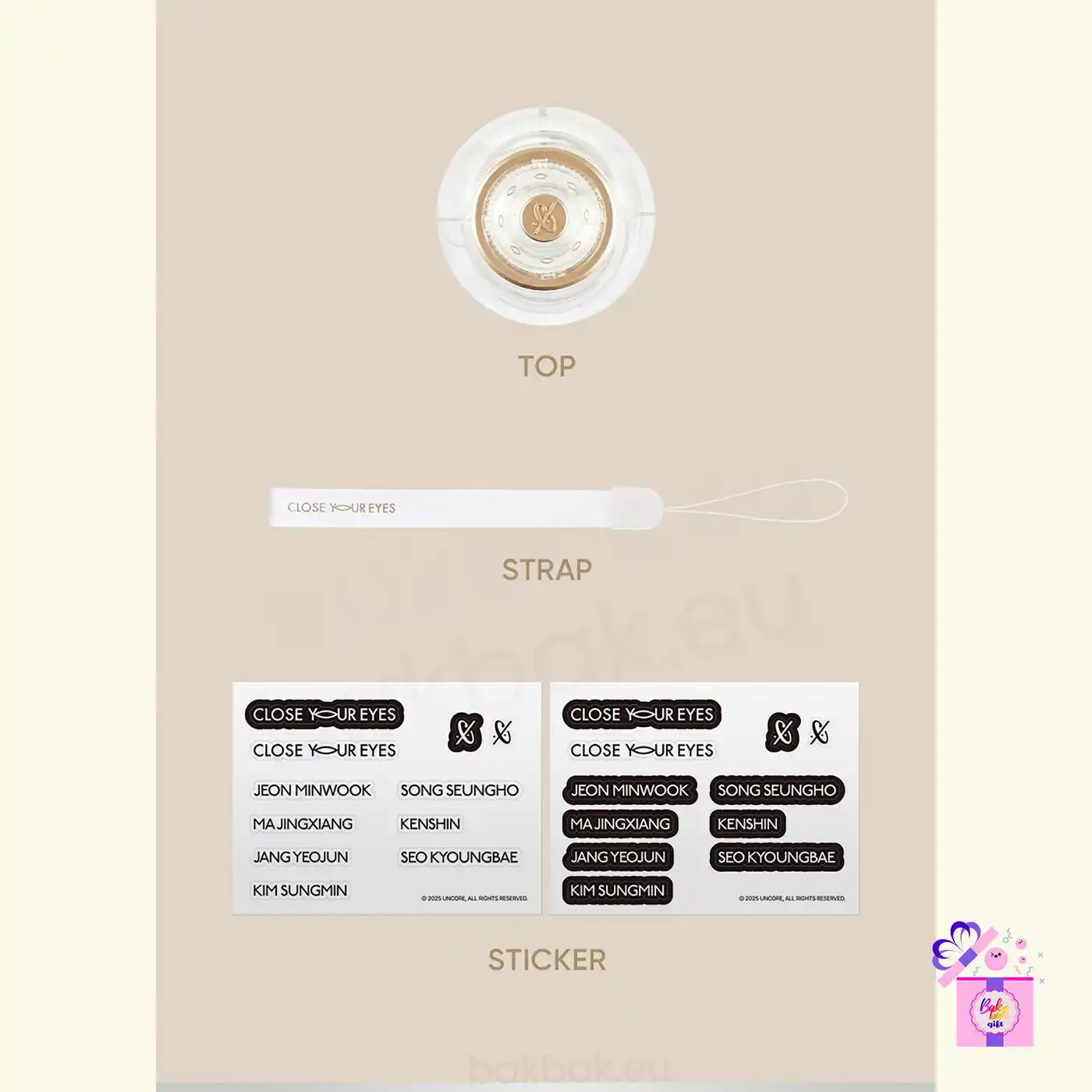 The CLOSE YOUR EYES Official Light Stick is the official cheering item for fans, designed with an elegant and sophisticated look that reflects the group’s identity. Its exclusive shape, combined with a translucent finish and gold-tone details, creates a modern and refined visual, making it ideal for both concerts and collection.