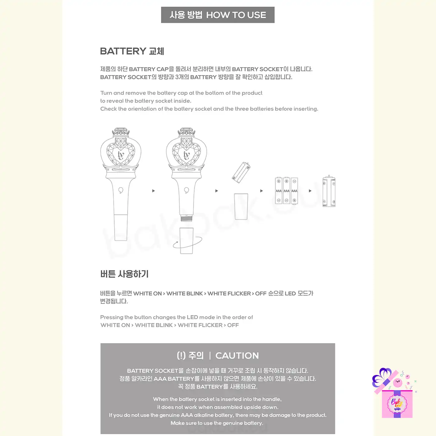 Equipped with multiple LED lighting modes, the light stick allows fans to switch between White On, White Blink, and White Flicker using the power button. In addition, the Bluetooth connectivity enables synchronized lighting effects during concerts when paired with the official IVE Light Stick application, creating a unified and immersive fan experience.