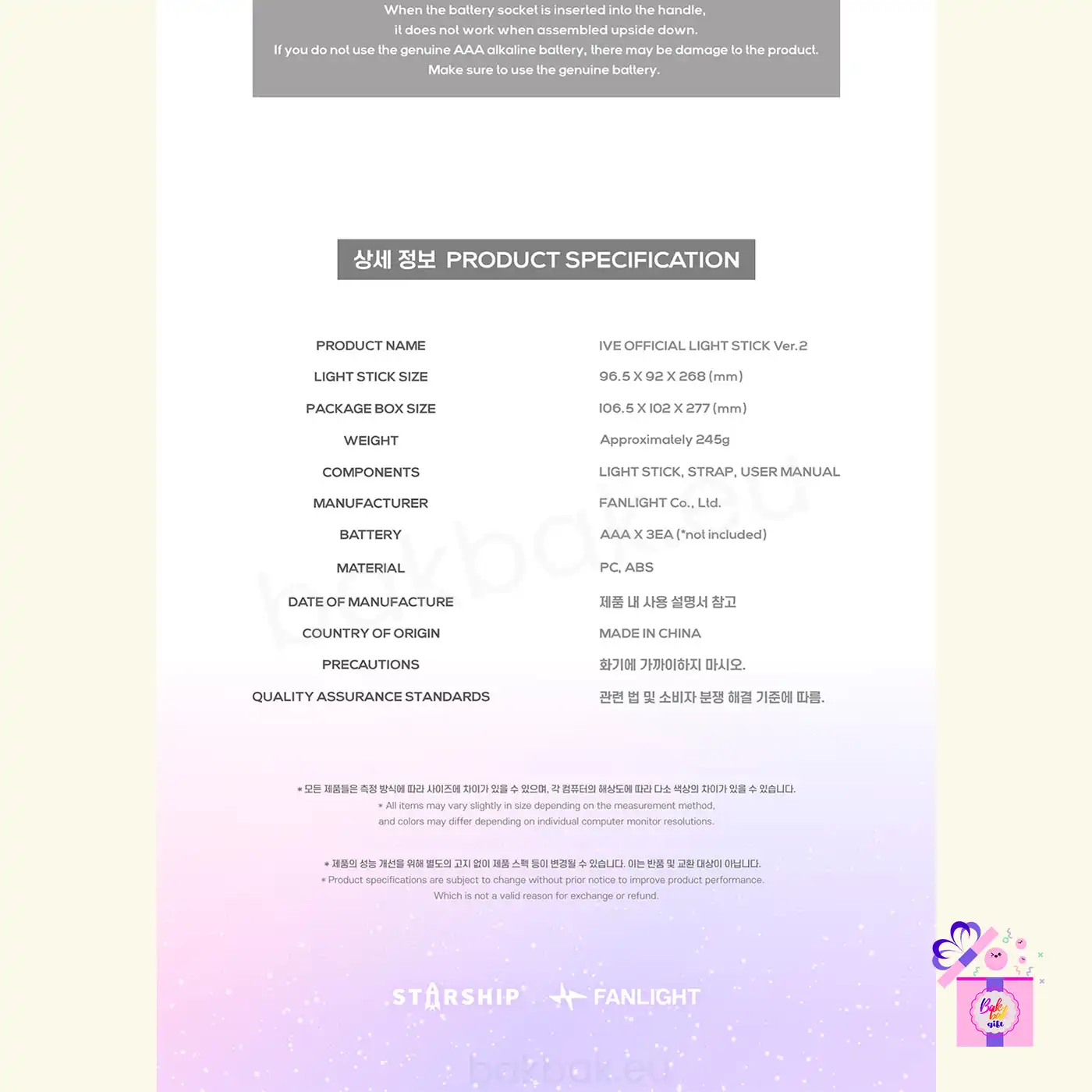 The detachable head design allows for customization, giving fans the freedom to decorate the interior with stickers or personal decorative elements, making each light stick uniquely their own. Designed for both performance use and collection, the IVE Official Light Stick Ver. 2 combines functionality, aesthetics, and emotional value.
