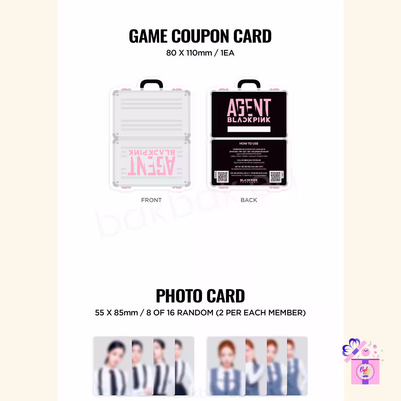 This collection features special photocards along with agent-themed collectible items, including QR cards and coupon cards related to additional content, as well as various decorative extras. A must-have item for BLACKPINK fans and K-POP photocard collectors.