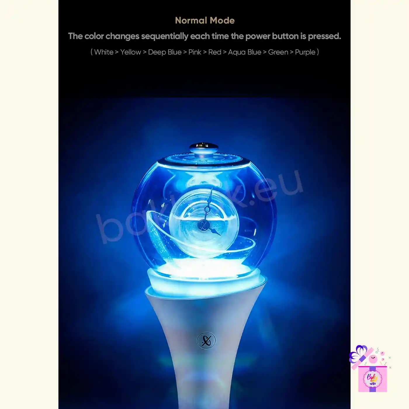 The light stick features multiple lighting modes, allowing sequential color changes through the power button, as well as a Bluetooth pairing mode, enabling synchronization during special events and performances.