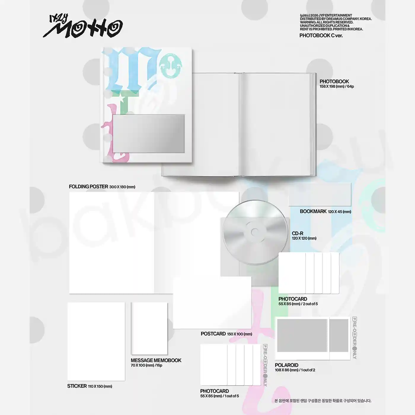 ITZY is back with their highly anticipated new EP MOTTO, released on May 18, 2026 via JYP Entertainment. The album features 8 tracks including solo songs from each of the five members. The PHOTOBOOK ver. is the premium collector’s edition, featuring a hardcover 64-page photobook, folding poster, sticker, CD-R, and multiple photocards — the most content-packed physical format of the release. Available in 3 versions (A, B, and C), each with a uniquely designed photobook cover.