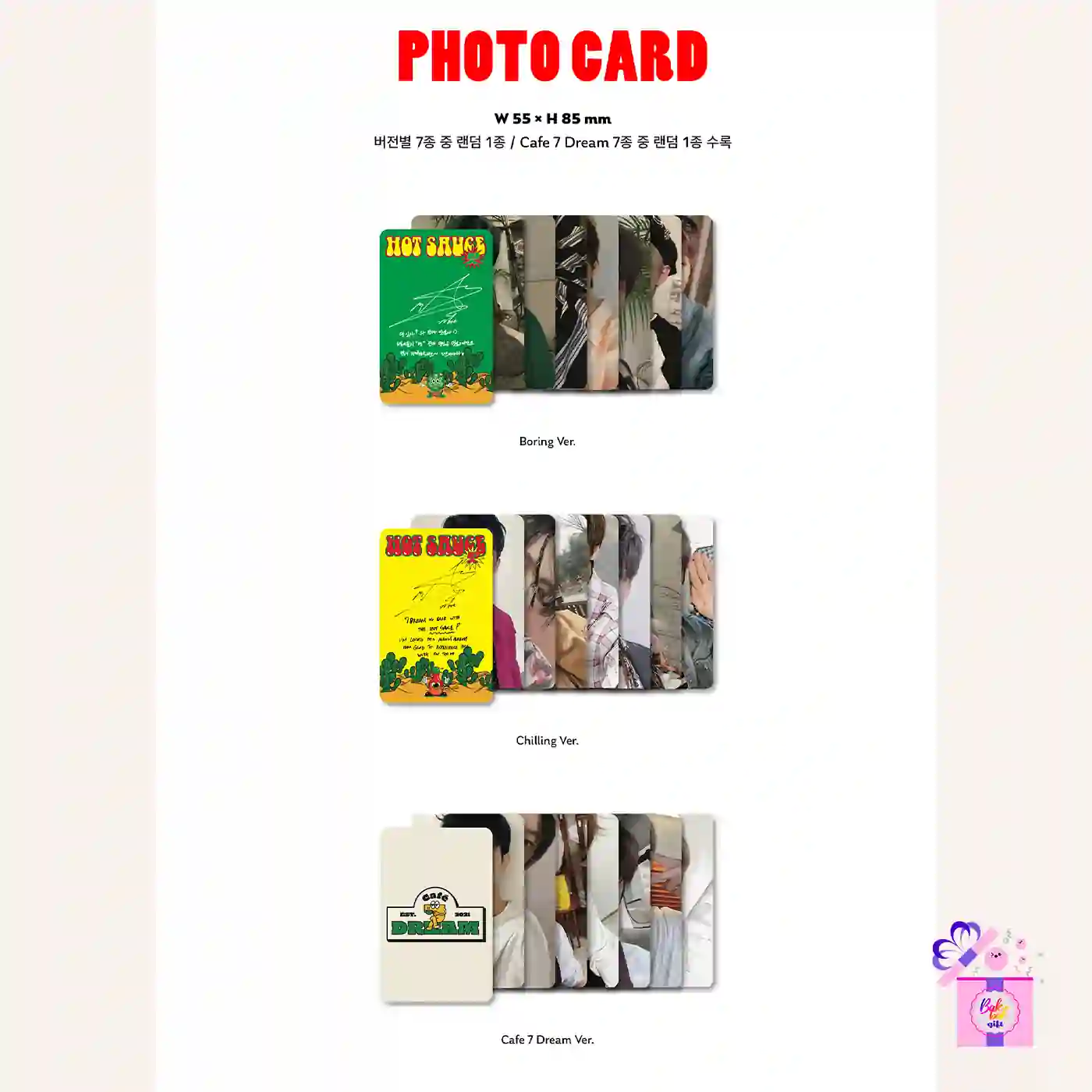 Although there is only one physical album, the photobooks come in three different versions (Crazy , Chilling, and Boring). The album also comes in a jewel case with 7 individual covers.