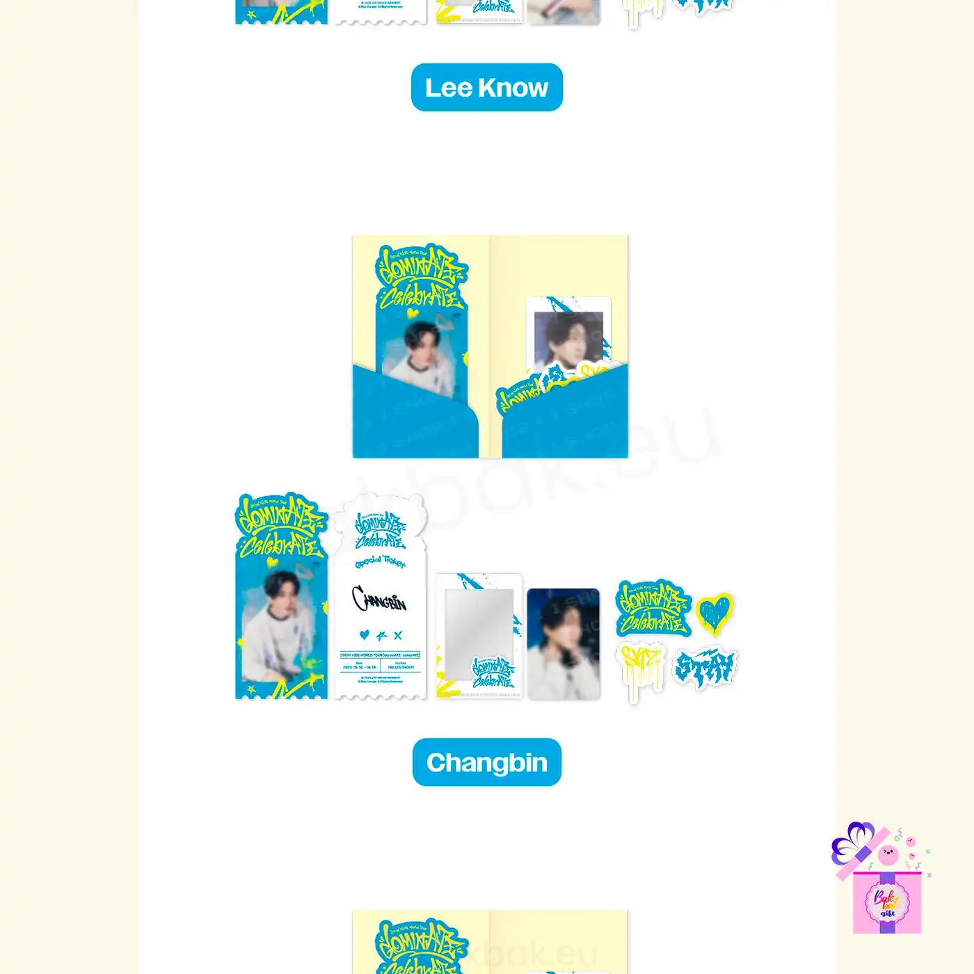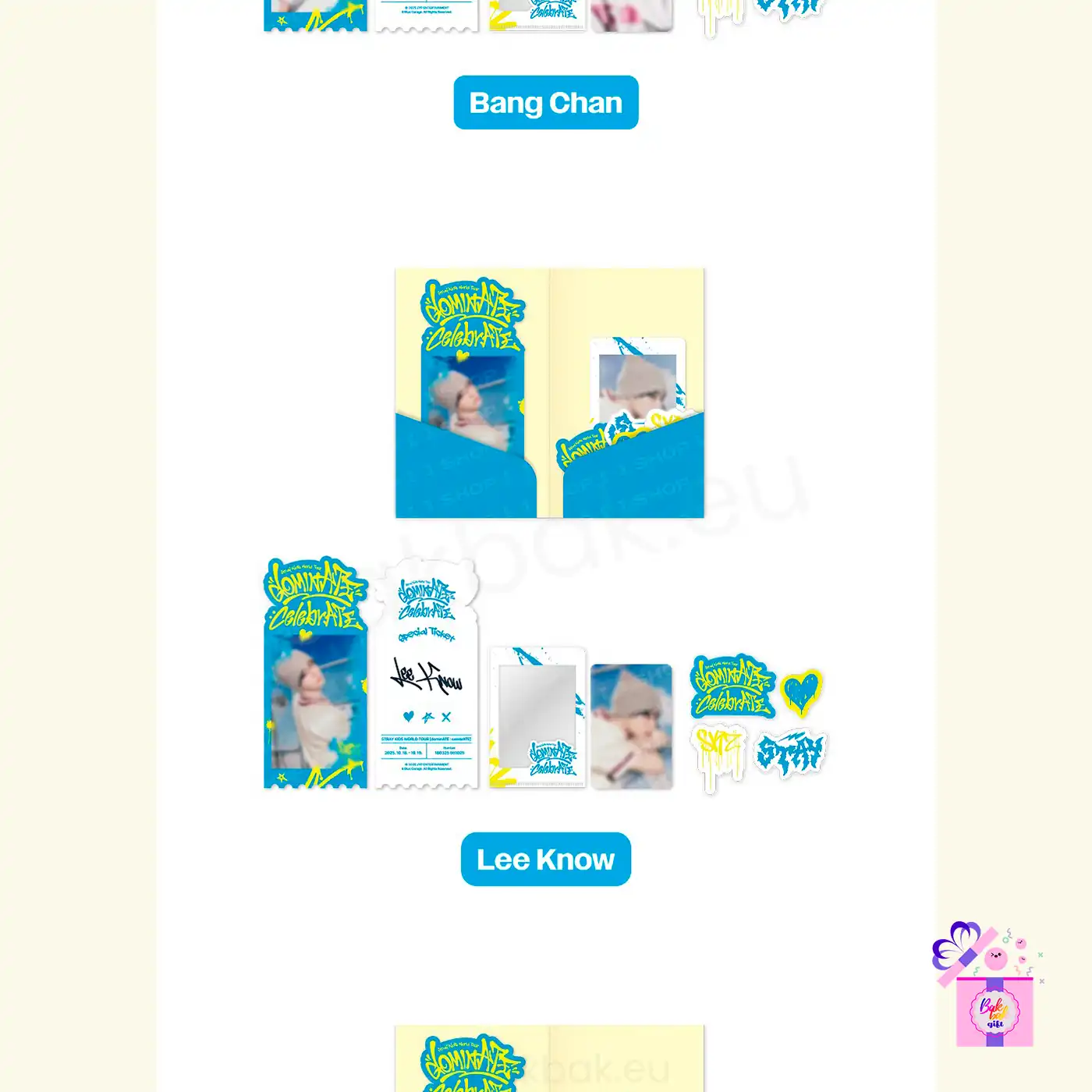 Each member’s version includes a Special Ticket, Mini L Holder, Photocard, and Sticker, all featuring bright blue and yellow tones that represent the joy, energy, and freedom of the celebrATE concept.
