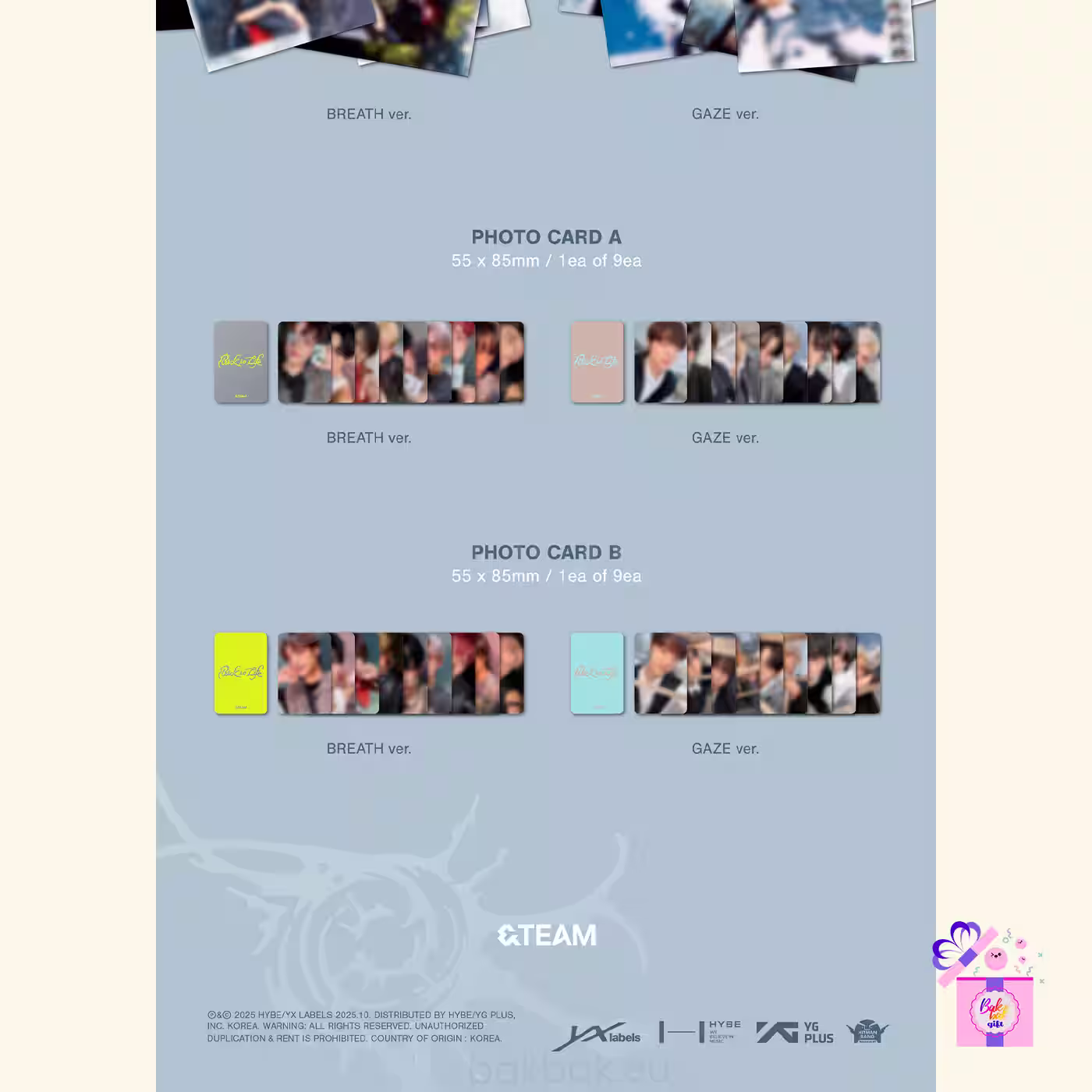 The physical album comes in the following versions: BREATH Ver., GAZE Ver., ROAR ver., Weverse Albums and Photocard Box Mini CD-R Ver.